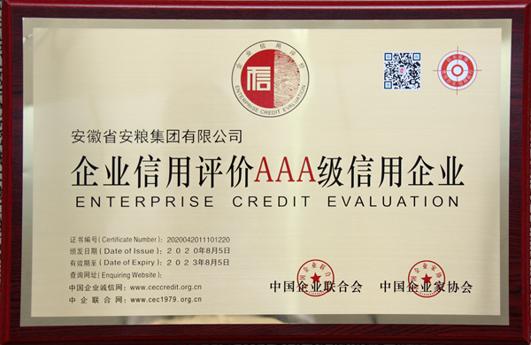 近日,中国企业联合会、中国企业家协会公布了2020年第一批信用企业名单,安粮集团及所属合肥建工公司双双荣获“企业信用评价AAA级信用企业”称号。