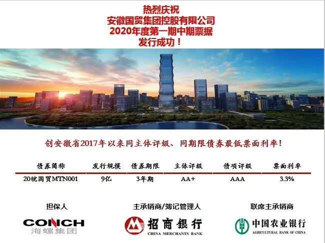 3月5日,国贸集团经过充分准备和筹划,成功发行2020年度第一期中期票据,募集资金9亿元,期限为3年,发行利率3.3%,创安徽省2017年以来同主体评级、同期限债券最低票面利率,也创造了国贸集团发债史上价格新低。