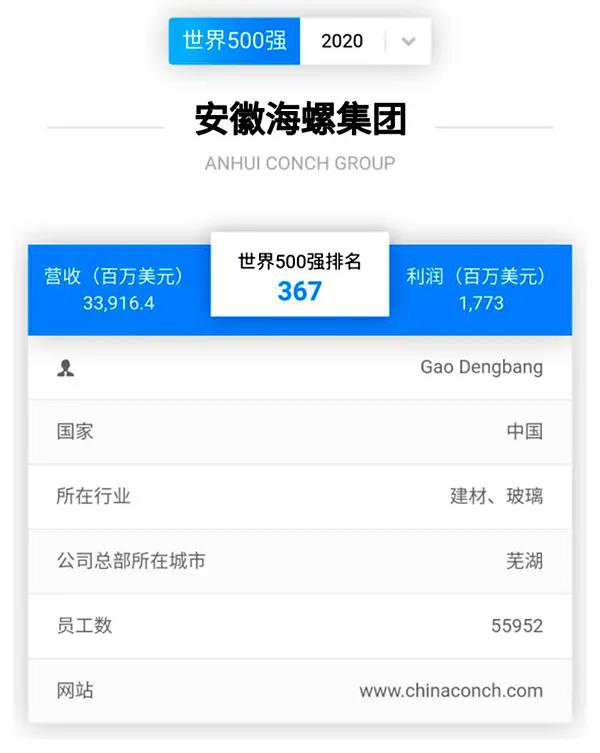 8月10日,《财富》杂志公布“2020世界500强企业”排名榜单。海螺集团继2019年首次进入世界500强之后,今年再次入围世界500强榜单并实现争先进位,以339.16亿美元的营业收入位列榜单第367位,比上年增长54.17亿美元,跃升74位,创造了历史最好成绩。
