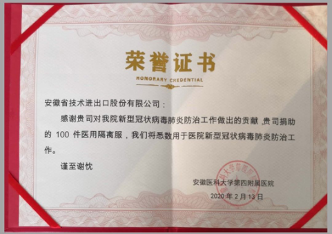 2月13日,安徽省技术进出口股份有限公司筹集采购的100件医用隔离服,顺利捐赠安徽医科大学第四附属医院,用于该院奋战在新冠肺炎疫情防治一线的医护人员。